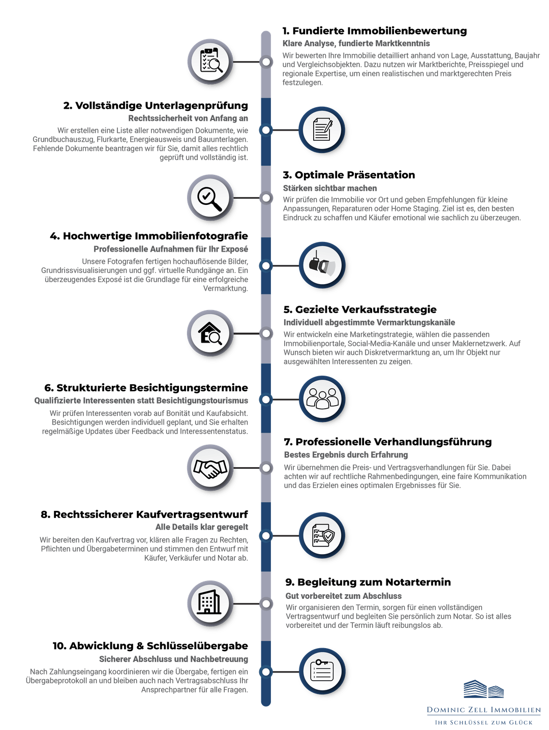 Der Verkauf einer Immobilie ist einer der wichtigsten Schritte im Leben. Damit Sie diesen Weg sicher und stressfrei gehen, haben wir einen klar strukturierten 10-Punkte-Verkaufsprozess entwickelt. Jeder Schritt ist darauf ausgerichtet, Ihre Immobilie optimal zu präsentieren, den passenden Käufer zu finden und den besten Preis zu erzielen – transparent, professionell und persönlich begleitet.